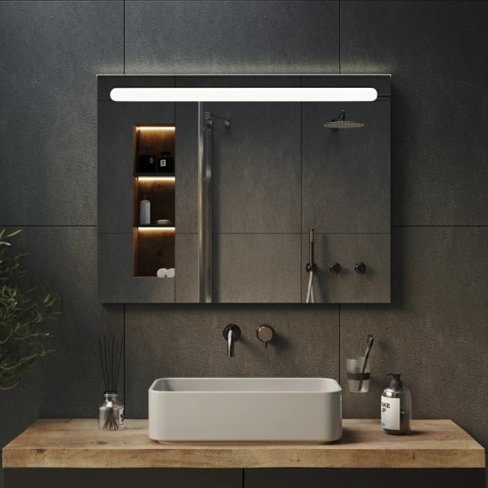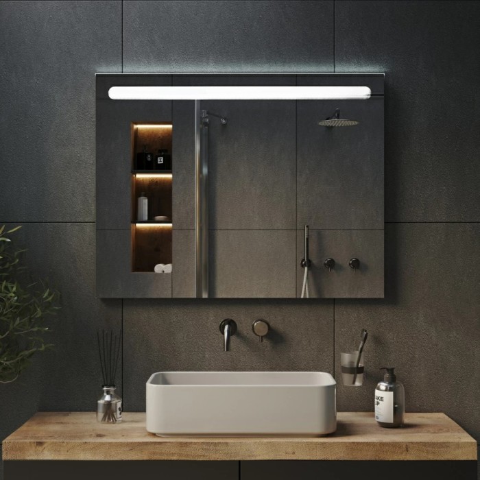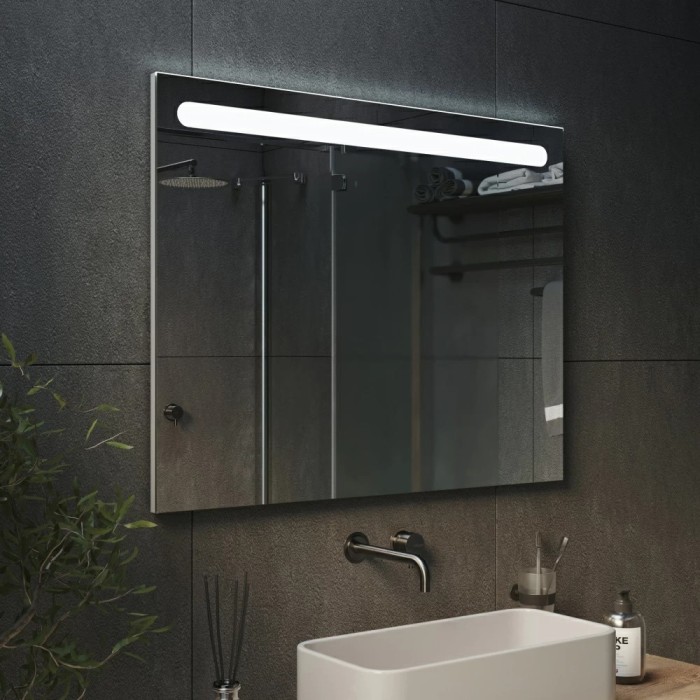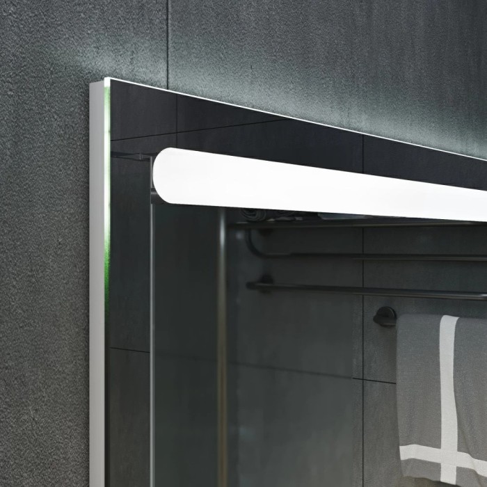 Підсвічування виконане у вигляді однієї акуратної світлової лінії вздовж верхнього краю дзеркала, забезпечуючи спрямоване й м’яке світло на обличчя.
