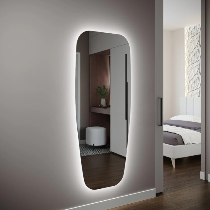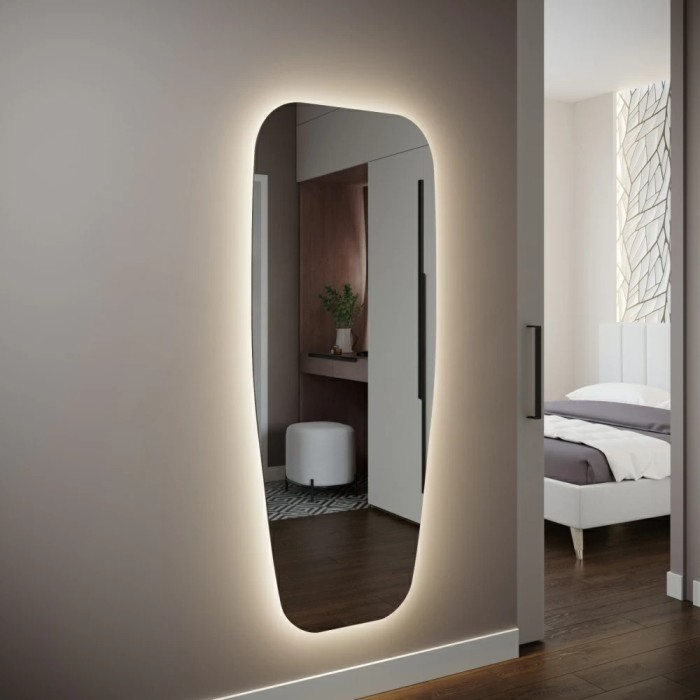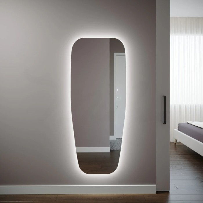 Підсвічування розташоване виключно на зворотному боці, створюючи ефект м’якого ореолу та візуальної невагомості дзеркала на стіні.