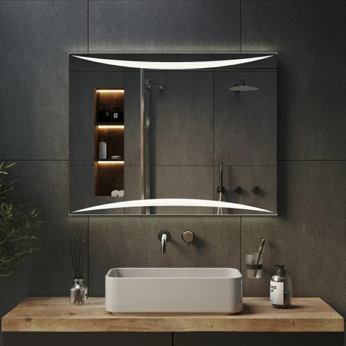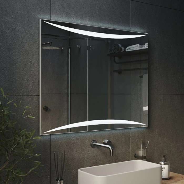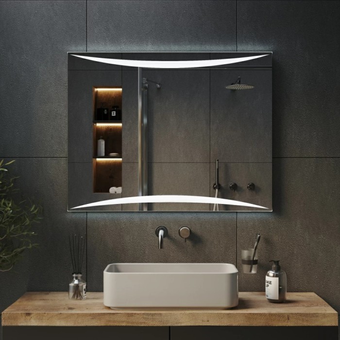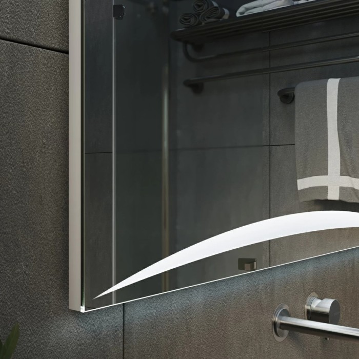 Дзеркало Stream — стильний акцент у сучасному інтер’єрі. Прямокутна форма поєднується з елегантними дугоподібними світловими лініями зверху та знизу, створюючи гармонійне візуальне оформлення. М’яке фронтальне підсвічування забезпечує рівномірне та комфортне освітлення обличчя — ідеальне для догляду, макіяжу чи ранкових ритуалів у ванній кімнаті.