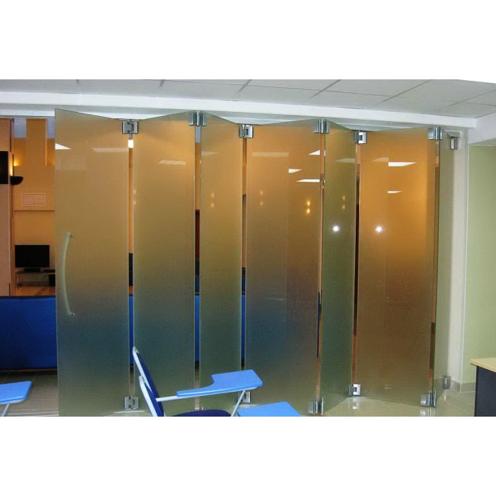 Алюмінієвий чи сталевий профіль забезпечує міцність системи, а сучасна фурнітура — легкість руху та щільне прилягання стулок. У складеному вигляді перегородка майже непомітна, а у розкладеному — ефективно розділяє зони, зберігаючи світло та відчуття простору.